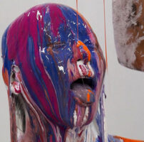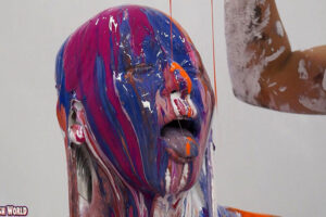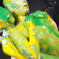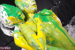 そんなオナニーに夢中の全身白い色の彼女に今度は緑色、黄色、青色のペイントをかけていく!