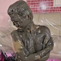 白パンティーを履いて体を金粉一色に染め上げていきます!