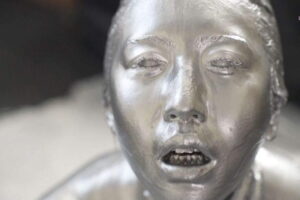 バケツを頭の上でひっくり返して滝のように流れ落ちる銅粉になすすべもないあかねちゃん。