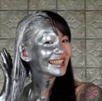 その後白く染まったからだの上から黒色のポスターカラーを上塗りされていくと、白と黒が混ざり合った身体が完成です。